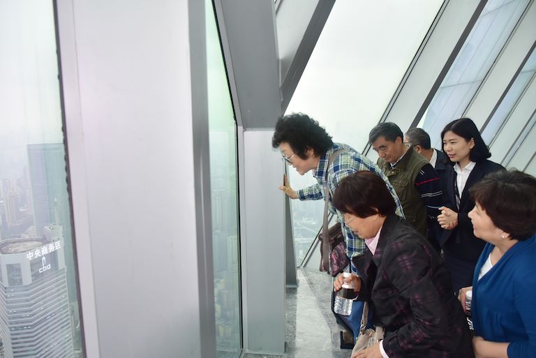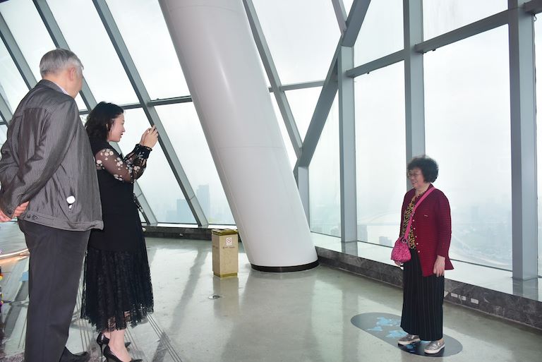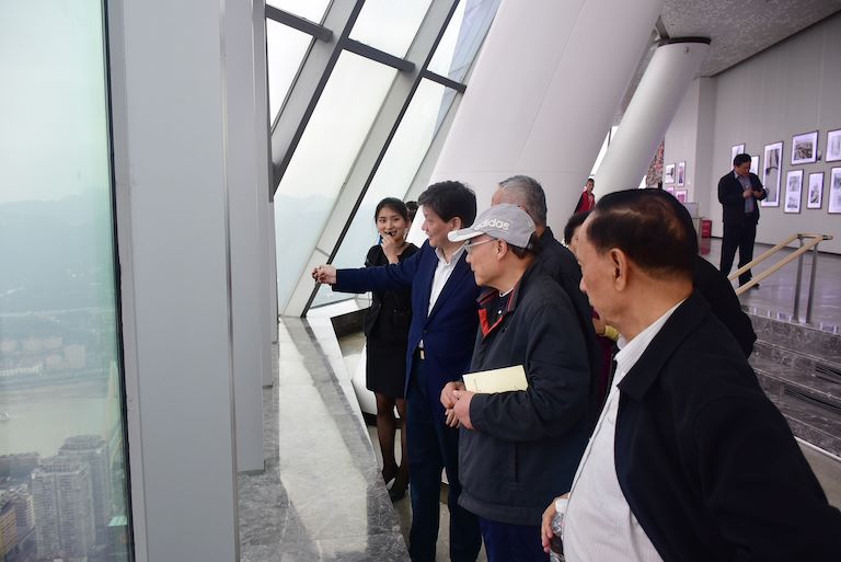 老同志們一行于下午5時許在市委常委、組織部長胡文容,市委組織部副部長、老干部局長陳全,渝中區(qū)區(qū)委書記黃玉林,區(qū)委常委、組織部部長王志宏等領(lǐng)導(dǎo)的陪同下陸續(xù)達到WFC。隨后,老同志們在工作人員的引導(dǎo)下陸續(xù)乘坐高速電梯抵達WFC觀景臺。