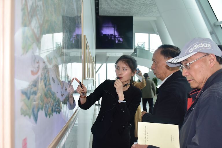 抵達觀景臺后,老同志們興致勃勃,游覽情緒高漲,對WFC的建造歷程、360°山城新景觀及母城文化表現(xiàn)出了濃厚的興趣。老同志們在工作人員的引導(dǎo)講解下,邊看邊議,邊議邊記,始終保持高昂的熱情。